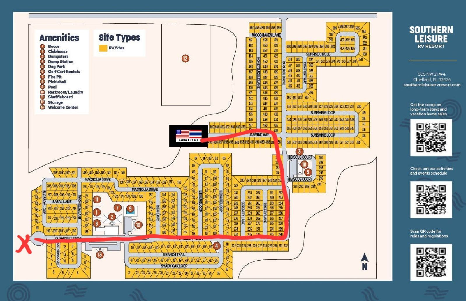 X = Start at Southern Leisure RV Resort Front Gate Entry